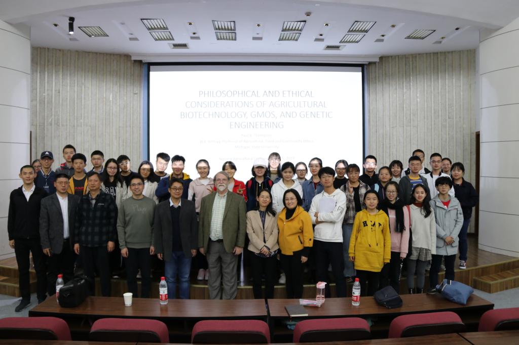马克思主义学院海外名家第三个系列讲座第三场于2019年11月5日19:00-21:00在ios版雷竞技官网卫岗校区图书馆报告厅举行。本场讲座由美国密西根州大学Paul B.Thompson教授作主题为“Philosophical and Ethical Consideration of Agricultural Biotechnology,GMOs and Genetic Engineering”的学术报告。讲座由刘战雄老师主持并翻译。全校同学共同聆听了本场讲座。