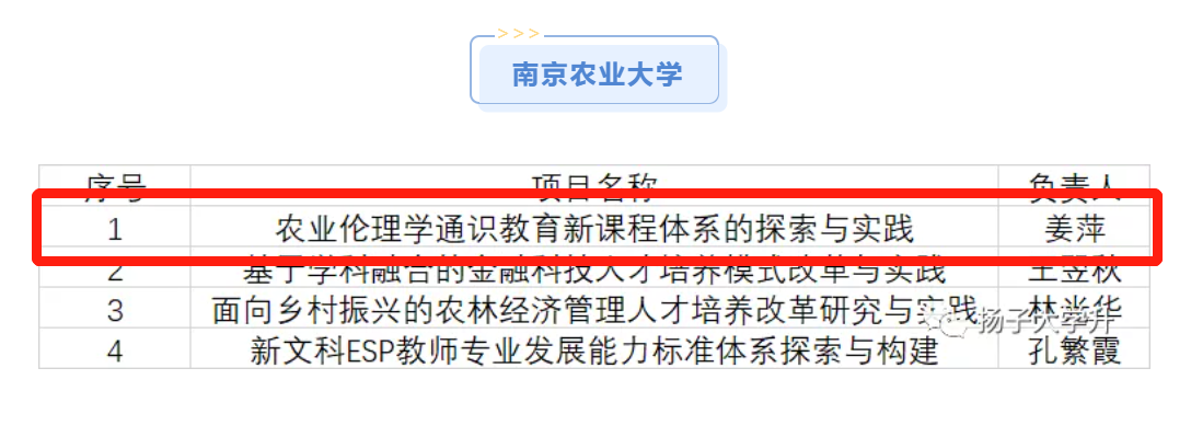 11月2日,教育部发布了《教育部办公厅关于公布首批新文科研究与改革实践项目的通知》(教高厅函〔2021〕31号),教育部决定认定1011个新文科研究与改革实践项目,其中江苏有25所高校的项目“榜上有名”,我院姜萍教授主持的项目“农业伦理学通识教育新课程体系的探索与实践”成功入选。