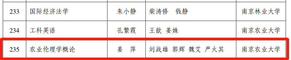 近日,江苏省教育厅发布了《省教育厅关于公布首批省级一流本科课程认定结果的通知》(苏教高函〔2021〕9号),公布了首批省级一流本科课程名单,由我院姜萍教授负责,严火其教授、刘战雄副教授和魏艾副教授参与的课程《农业伦理学概论》获得“首批省级一流本科课程(线下课程)”荣誉。