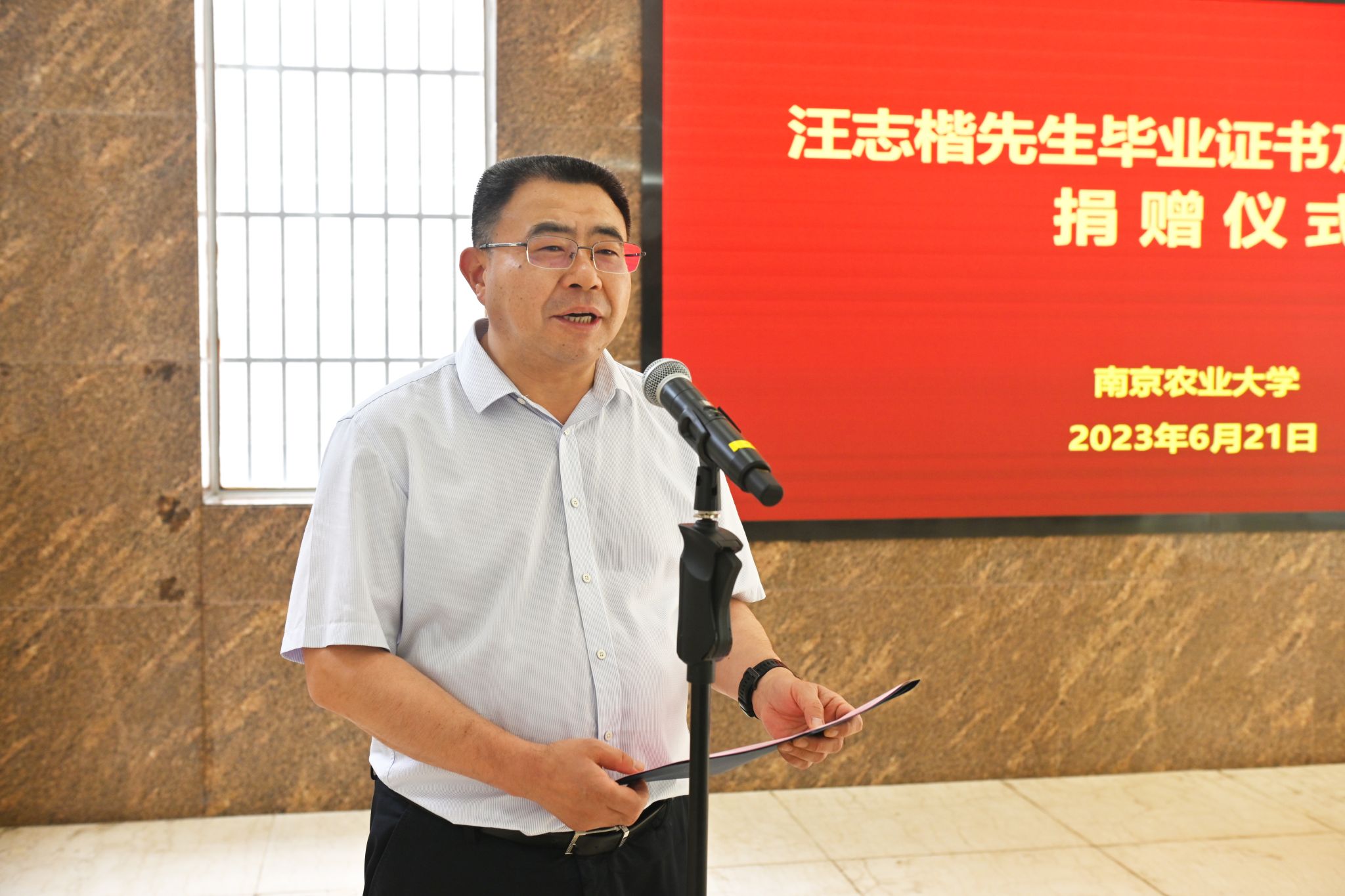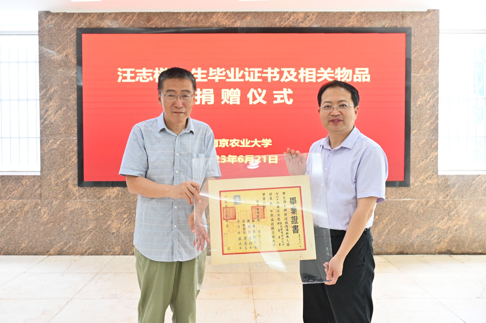 捐赠仪式上,汪德化先生向学校捐赠汪志楷先生的研究生毕业证书。图书馆馆长、文化遗产部部长郭忠兴代表学校接收毕业证书及其他物品。动物医学院党委书记姜岩代表学校向汪志楷先生家属颁发捐赠证书。