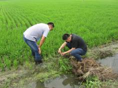 项目组专家还考察了六控稻米种植基地,对水稻目前的生长状况、水肥使用及灌溉、分蘖期生产注意事项等进行了实地指导。