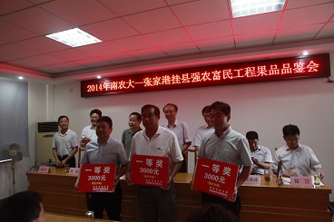 颁奖仪式由徐江主任主持,他介绍了本次果品品鉴会举办的目的和意义,并回顾了南农大和张家港实施挂县强农富民工程以来取得的成绩。陈巍代表评审专家组介绍了果品评比的依据及流程,并宣读了获奖名单。