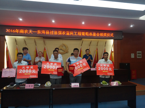 8月17日,我校新农村发展研究院办公室主任陈巍、副主任李玉清,挂县强农富民工程专家陶建敏教授、蔡斌华副教授、王三红副教授,赴东海开展挂县强农富民工程葡萄品鉴会。东海县政府副主席丁相玖,东海县林牧业局局长周育民、副局长卜剑锋,连云港市农委人教处处长古隆钧等出席。我校新农办基地事务部徐敏轮、东海县林牧业局徐娟玲、谢春毅等参加了活动。