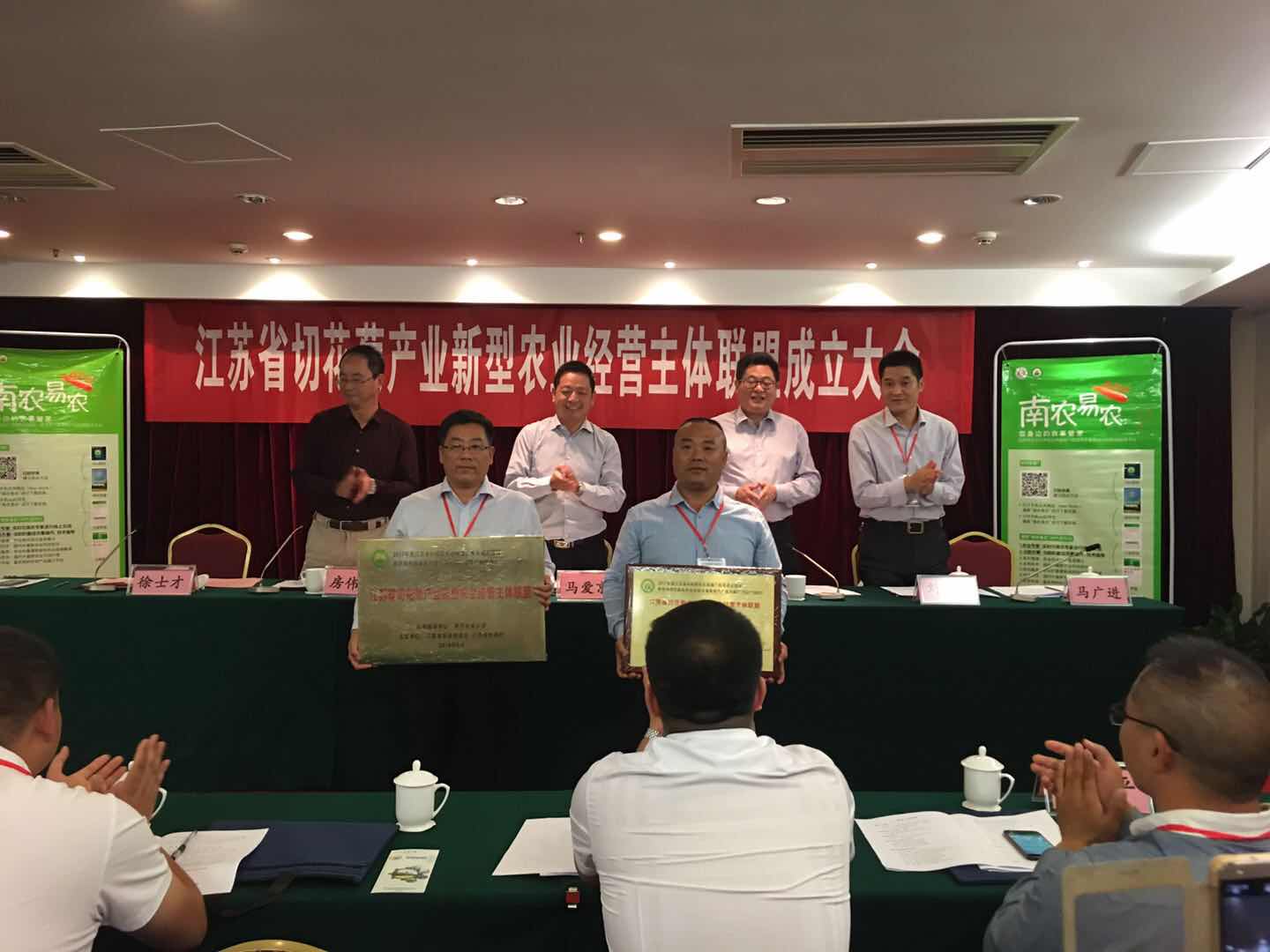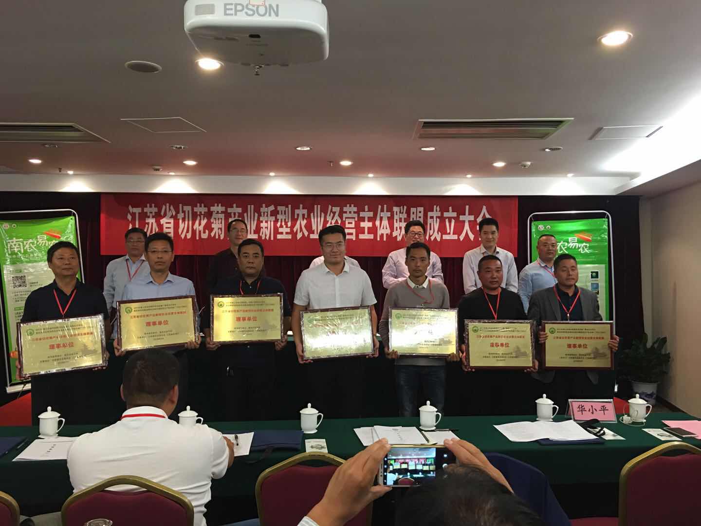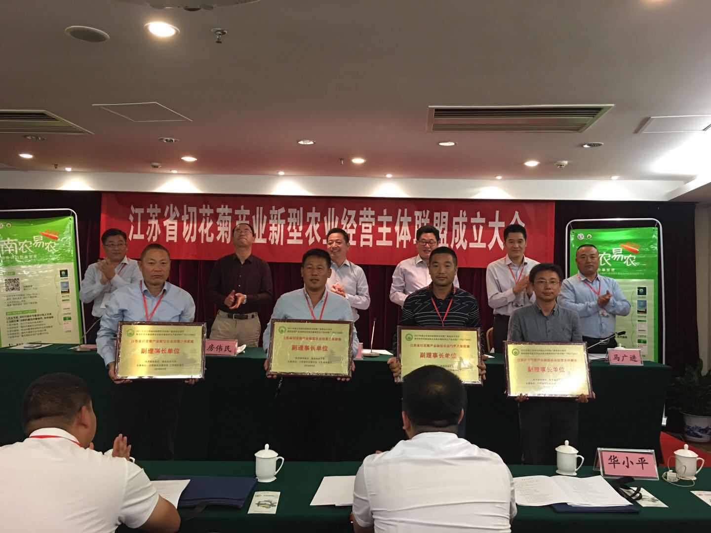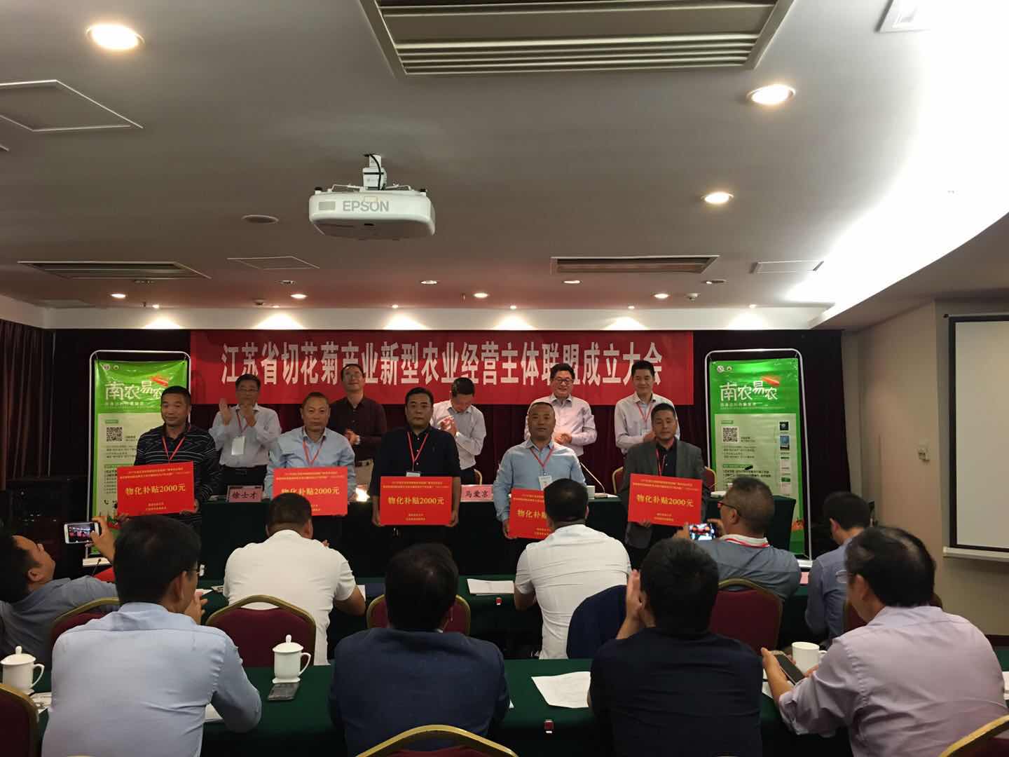 陈巍首先介绍了切花菊产业试点项目实施背景。房伟民教授介绍了江苏省切花菊产业新型农业经营主体联盟成立的背景与意义。徐士才就联盟筹建工作情况进行了阐述。会议通过了联盟章程,并选举出了联盟理事长、副理事长、秘书长和理事。马爱京、陈巍、房伟民等共同给联盟理事长、副理事长、理事授牌,向棋盘镇、马陵山镇等新沂市和东海县6个乡镇授“科技服务站点”铜牌,并发放物化补贴。随后,联盟理事长马广进介绍了联盟开展后续工作的计划。