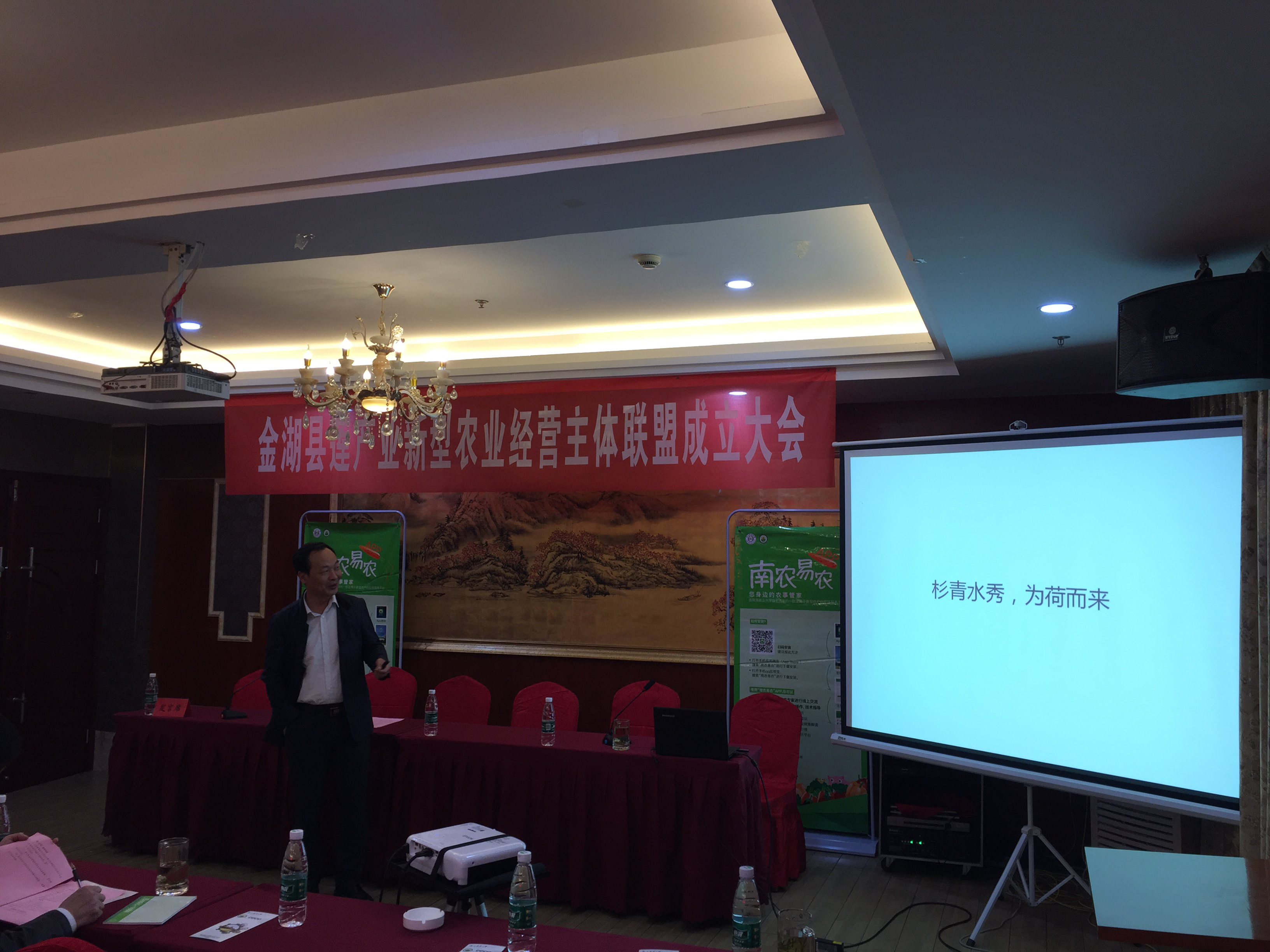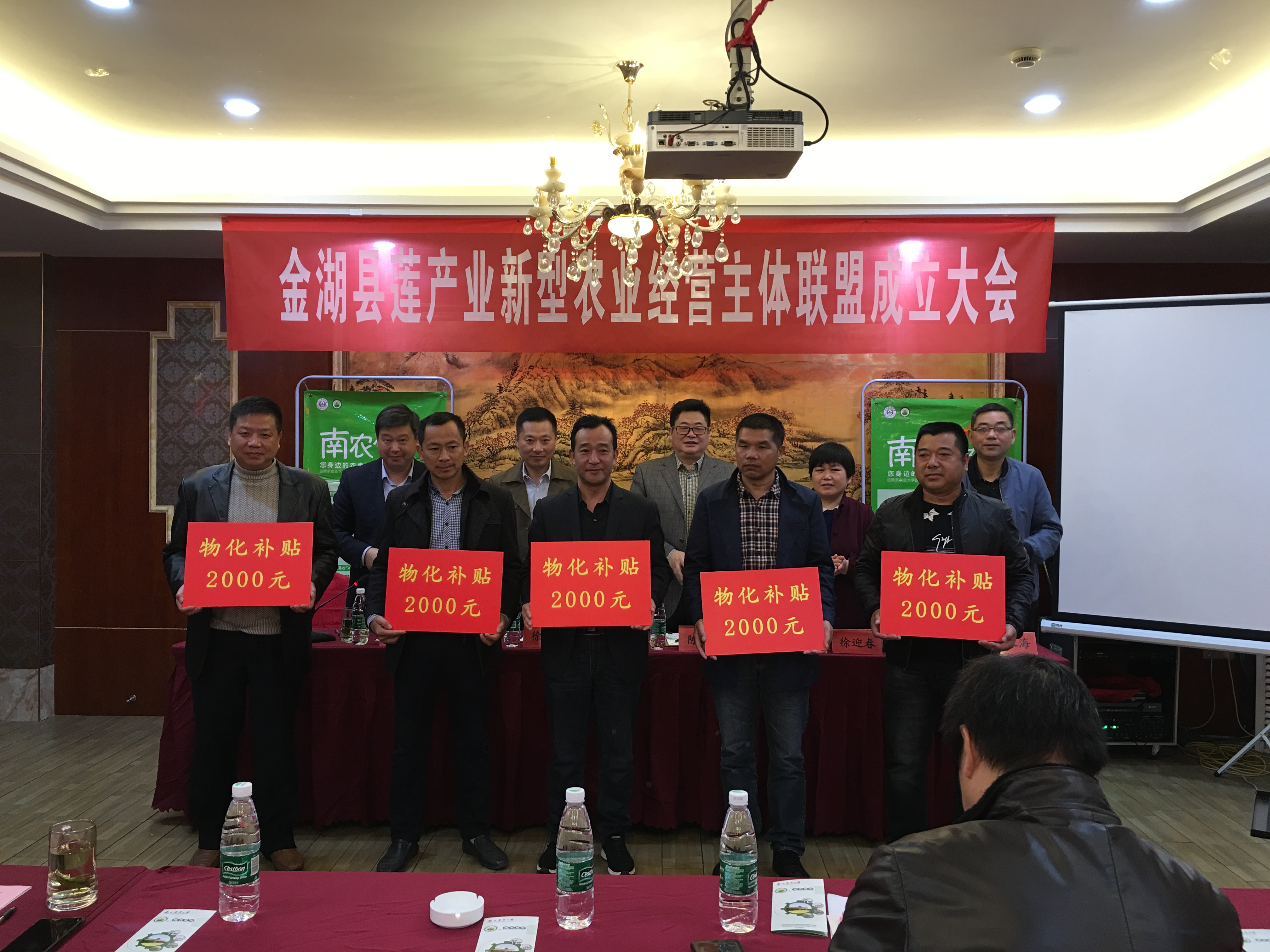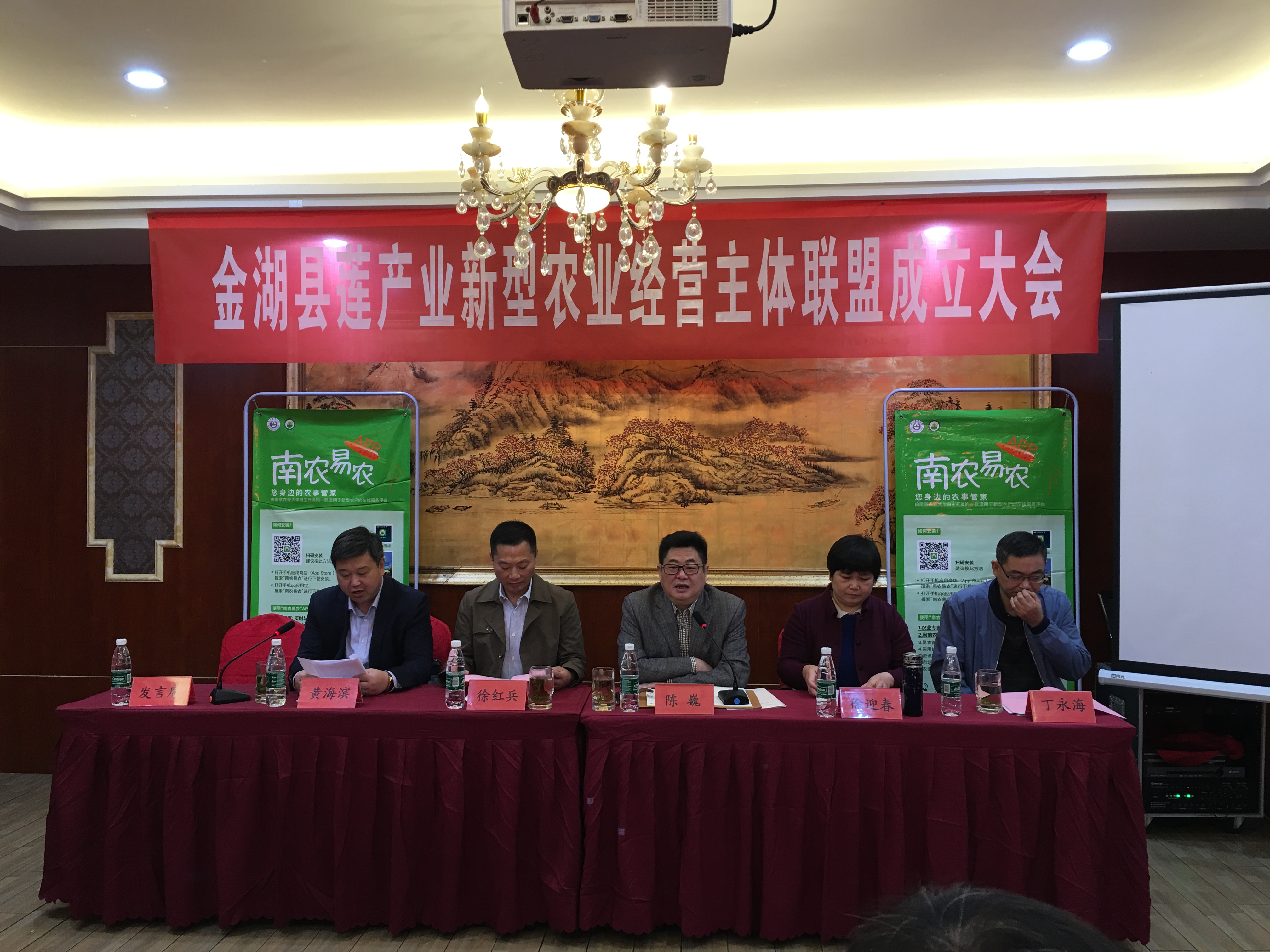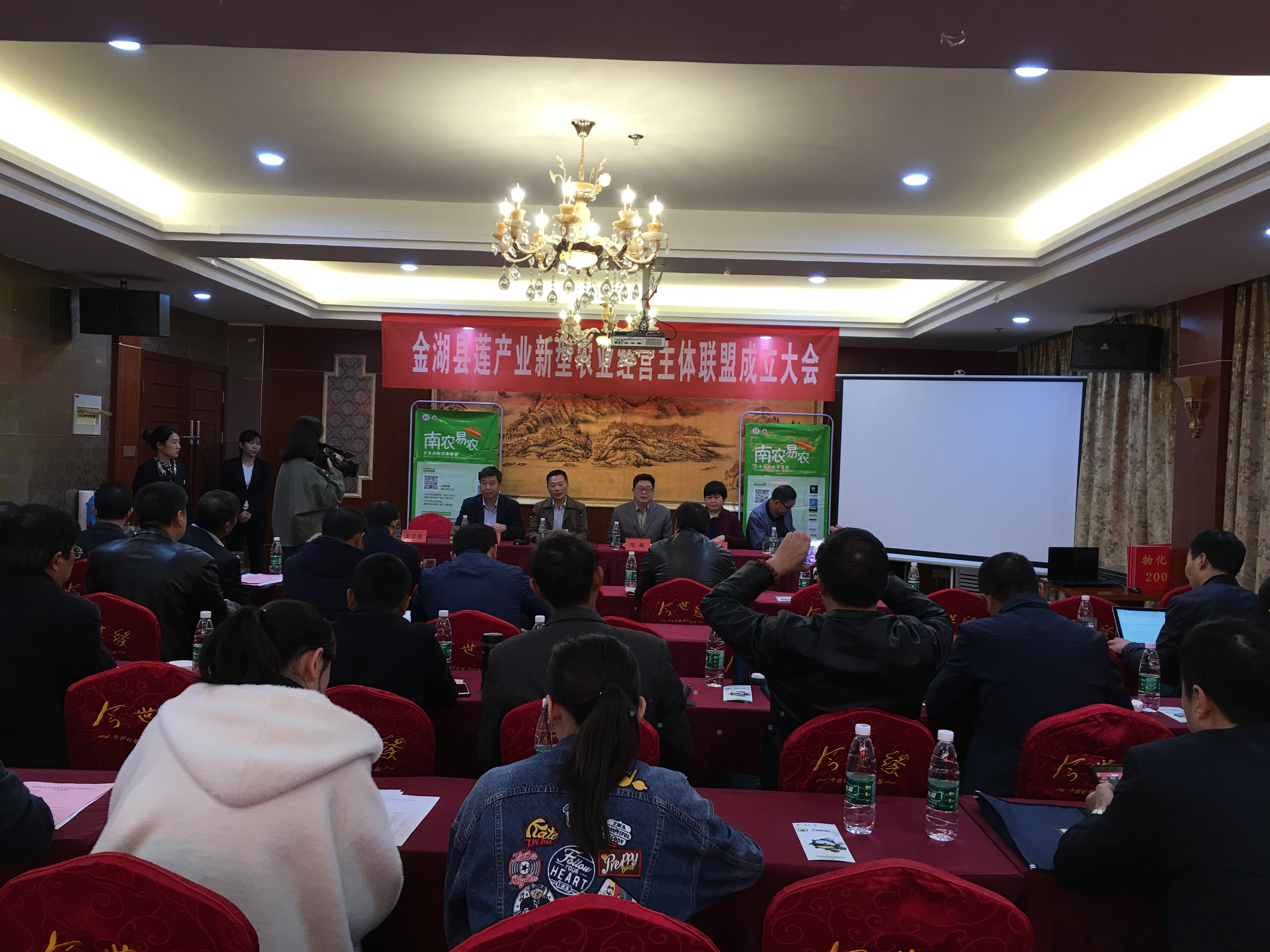 为更好地推动2017年度江苏省科研院校农技推广服务试点项目“(菊花)荷花新品种及全程高效生产技术推广”(TG(17)002)项目的开展。2018年11月5日我校与金湖农委在金湖县渔枫国际大饭店共同举办了金湖莲产业新型农业经营主体联盟成立大会。新农办主任陈巍、金湖县副县长徐红兵、金湖县农委主任黄海滨、食品科技学院韩永斌教授、项目负责人徐迎春副教授、项目团队成员金奇江副教授以及金湖县从事荷莲产业的新型农业经营主体成员50余人参加了会议。会议由黄海滨主持。