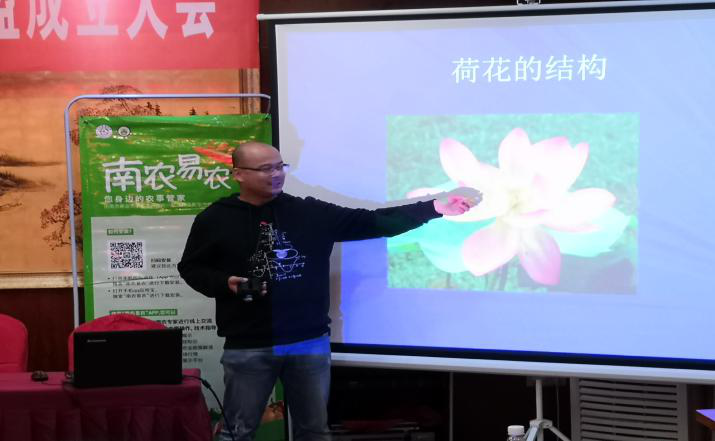 江苏南皇阳农业科技有限公司杨晓阳介绍了“南农易农”APP,并进行了现场培训与安装。金奇江、韩永斌分别作荷花栽培技术、莲藕加工技术培训。