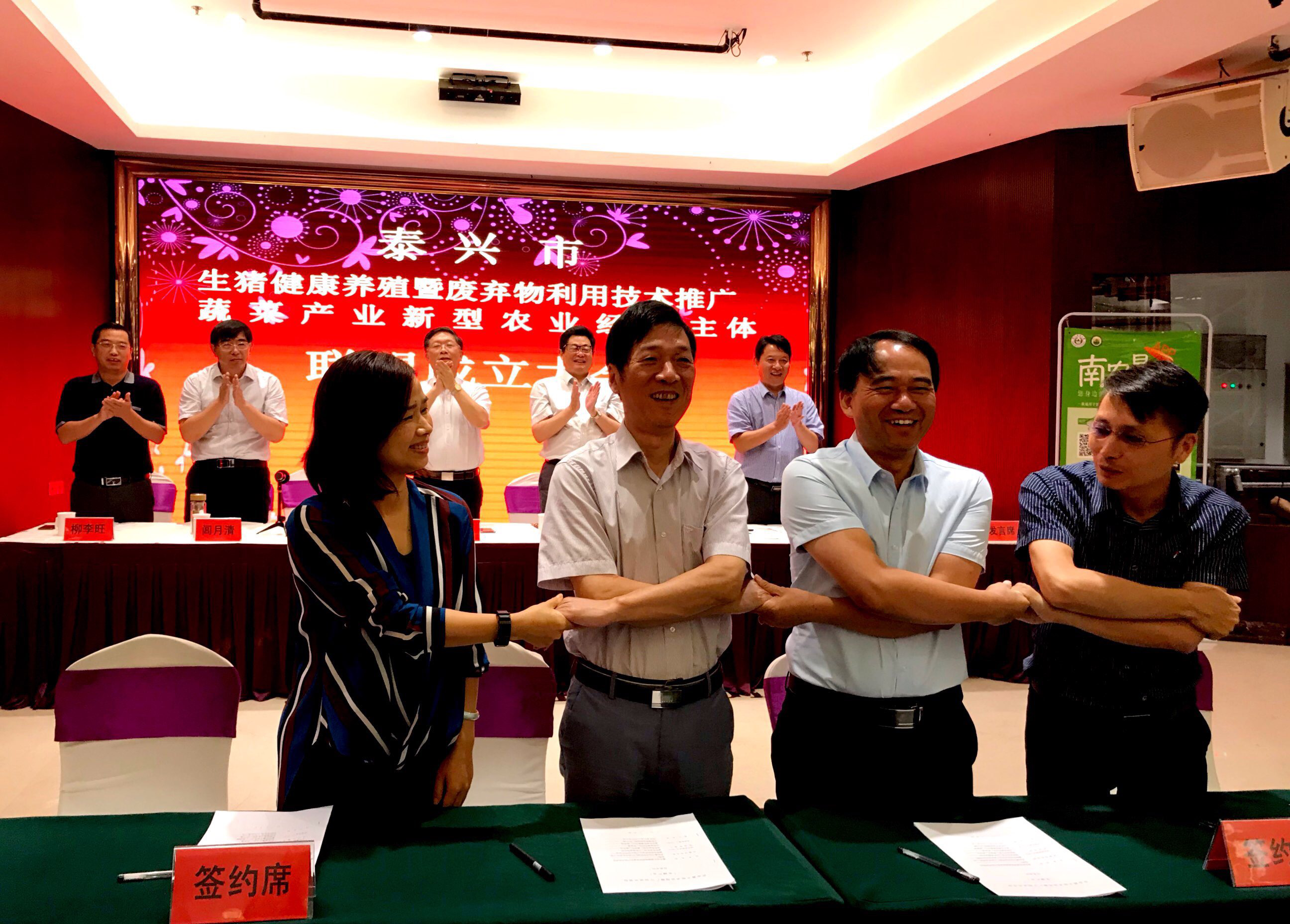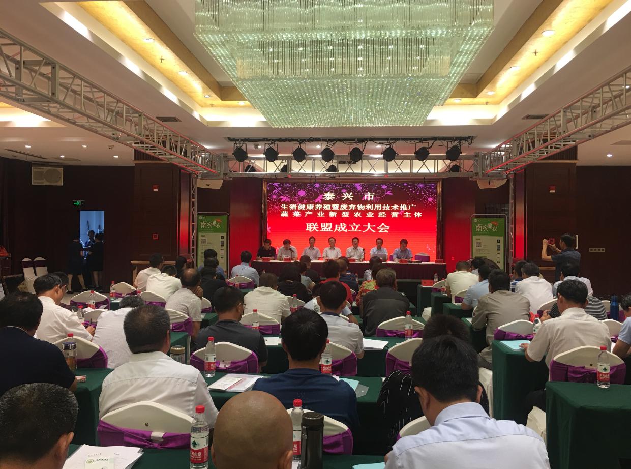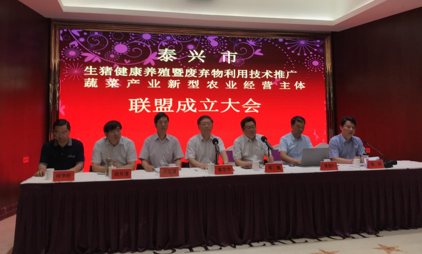 2019年7月10日,ios版雷竞技官网农业重大技术协同推广计划试点项目组在泰兴市举行了“生猪健康养殖暨废弃物利用技术推广和蔬菜产业新型经营主体产业联盟”成立大会。江苏省农业农村厅科教处处长姜雪忠、ios版雷竞技官网社会合作处处长陈巍、江苏省畜牧总站副站长贡玉清、泰兴市农业农村局局长闾月清与项目组首席专家及江苏省农科院、扬州大学等协作单位的专家参加会议。会议由泰兴市农业农村局副局长陈君主持。