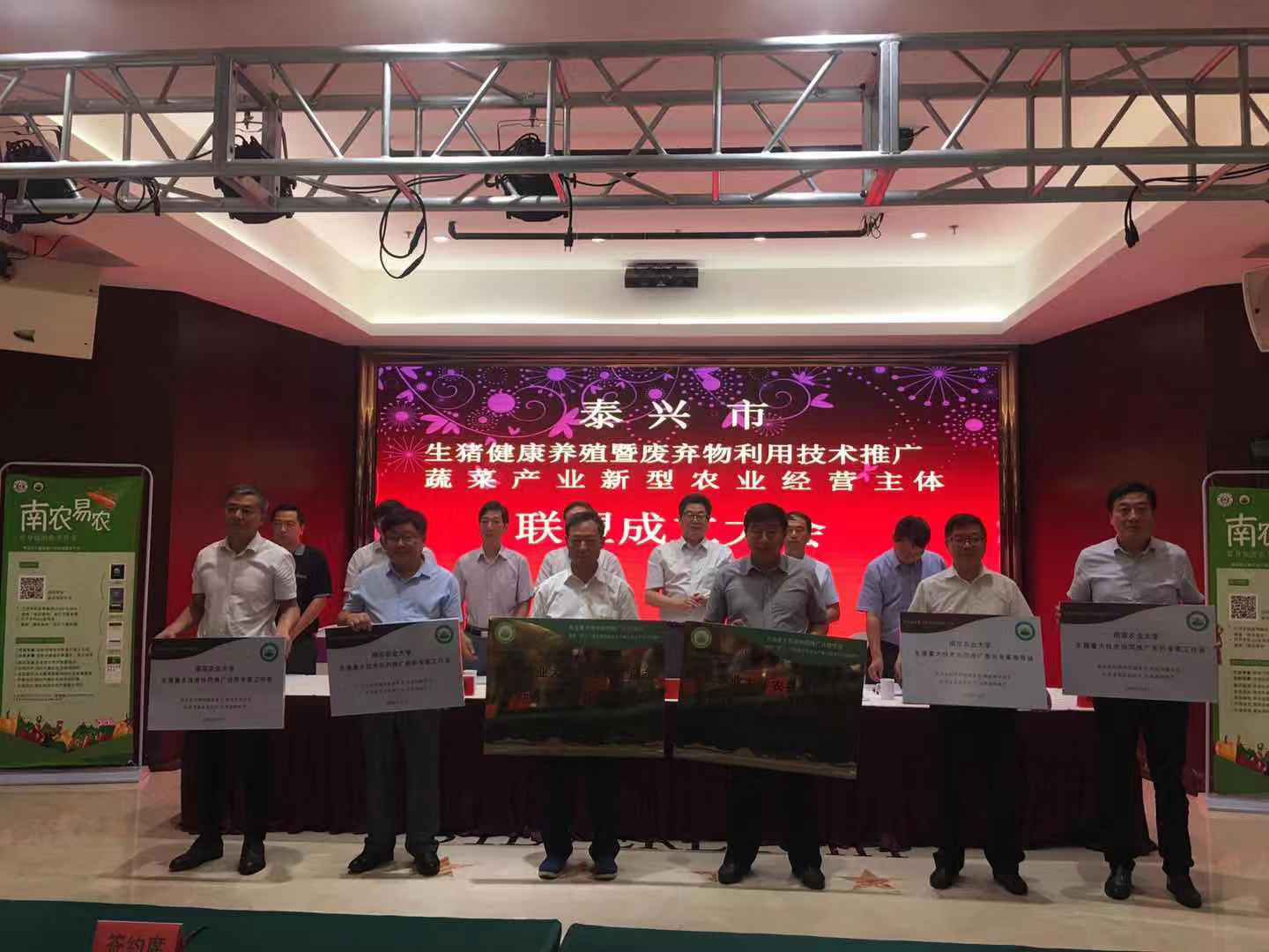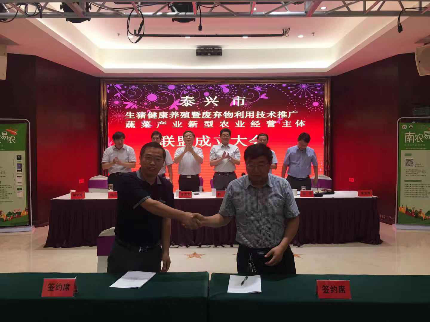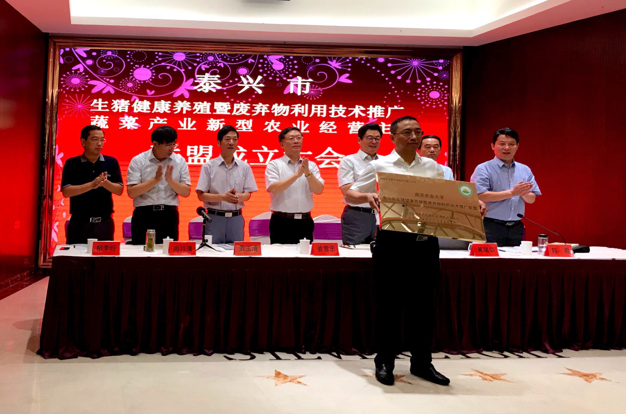 2019年7月10日,ios版雷竞技官网农业重大技术协同推广计划试点项目组在泰兴市举行了“生猪健康养殖暨废弃物利用技术推广和蔬菜产业新型经营主体产业联盟”成立大会。江苏省农业农村厅科教处处长姜雪忠、ios版雷竞技官网社会合作处处长陈巍、江苏省畜牧总站副站长贡玉清、泰兴市农业农村局局长闾月清与项目组首席专家及江苏省农科院、扬州大学等协作单位的专家参加会议。会议由泰兴市农业农村局副局长陈君主持。