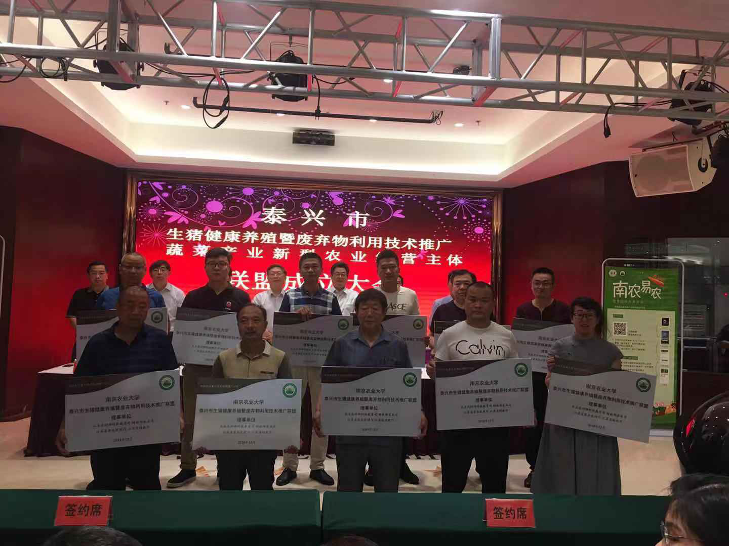 姜雪忠和陈巍向理事单位与协同推广项目专家指导站、专家工作室授铜牌。联盟第一届理事会理事长、江苏洋宇生态农业有限公司董事长唐红建作表态发言。与会领导向新型农业经营主体代表发放了物化补贴及技术培训资料。生猪项目首席专家、我校动科学院黄瑞华教授,蔬菜项目专家、我校园艺学院柳李旺教授等分别与基层技术负责人签署专家任务书。