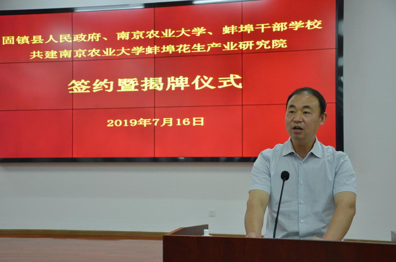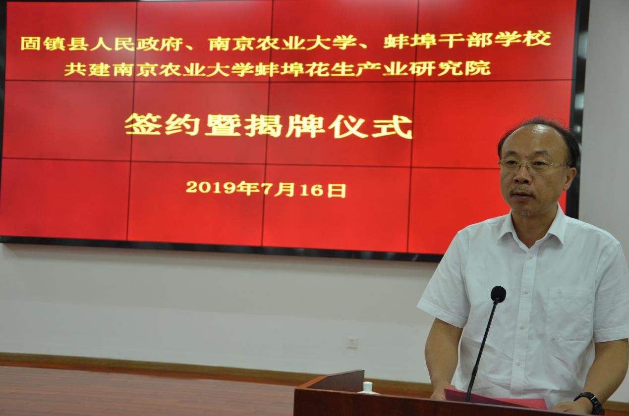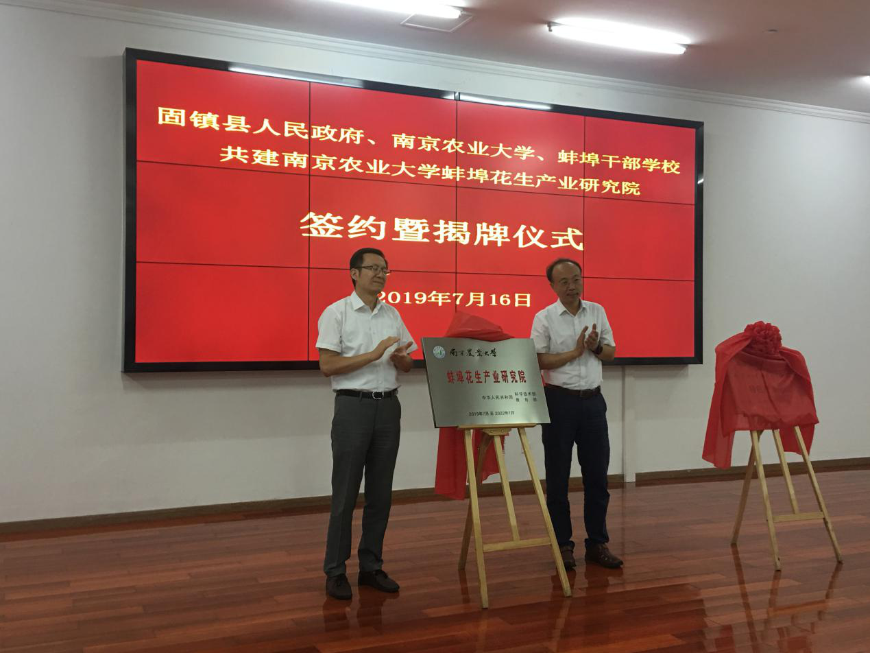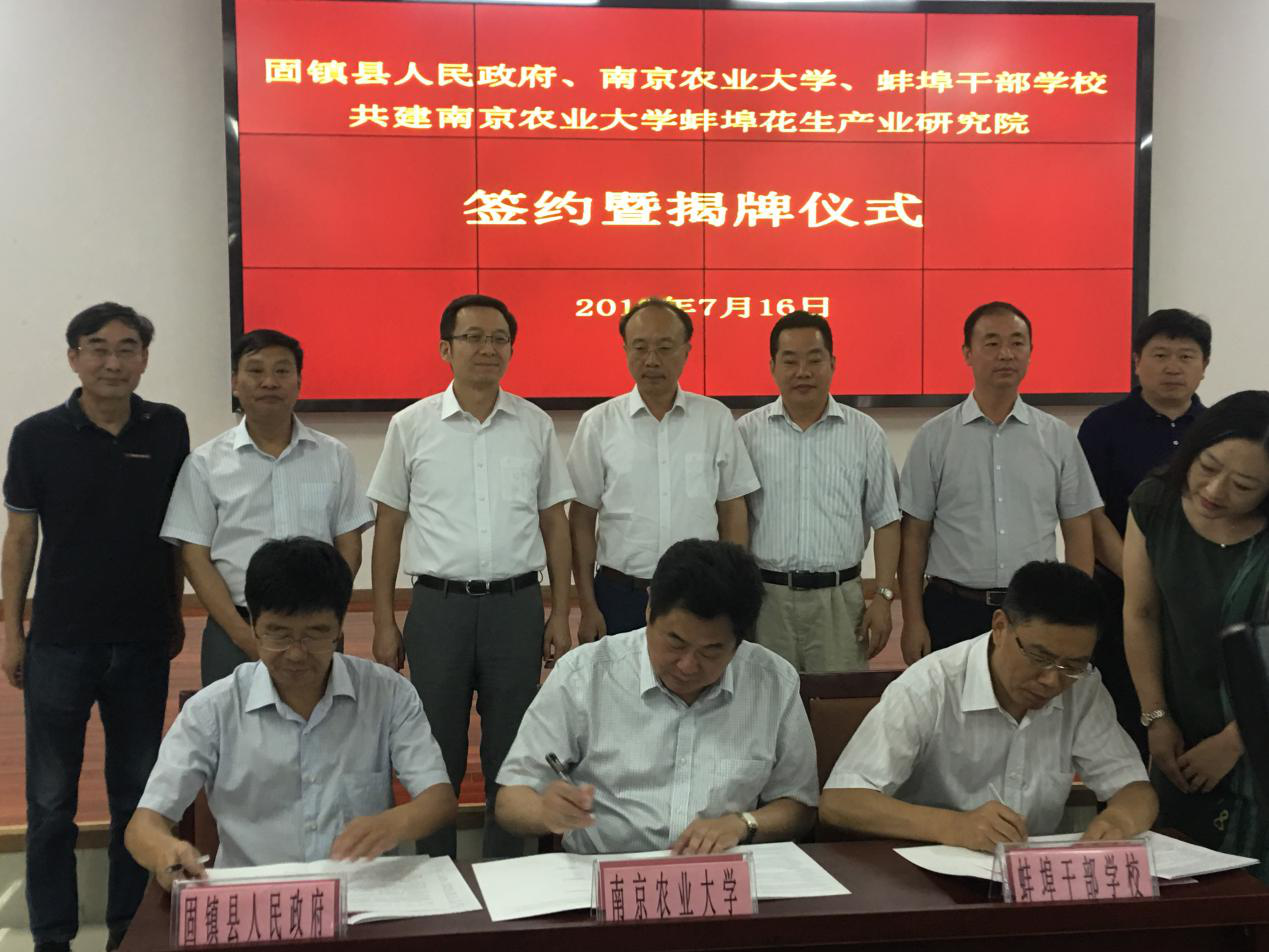 2019年7月16日上午,ios版雷竞技官网和固镇县人民政府、蚌埠干部学校共建“ios版雷竞技官网蚌埠花生产业研究院”签约暨揭牌仪式在蚌埠干部学校举行。我校党委常委、副校长丁艳锋、社会合作处处长陈巍、人文学院党委副书记冯绪猛以及部分专家,蚌埠市委常委、副市长郭鹏、固镇县委书记吴永斌、副县长张允武以及蚌埠市发改委、科技局、人社局、自然资源及规划局、农业农村局负责人,蚌埠干部学校党委书记张军、校长李安东、副校长万敦友等出席此次签约揭牌仪式。