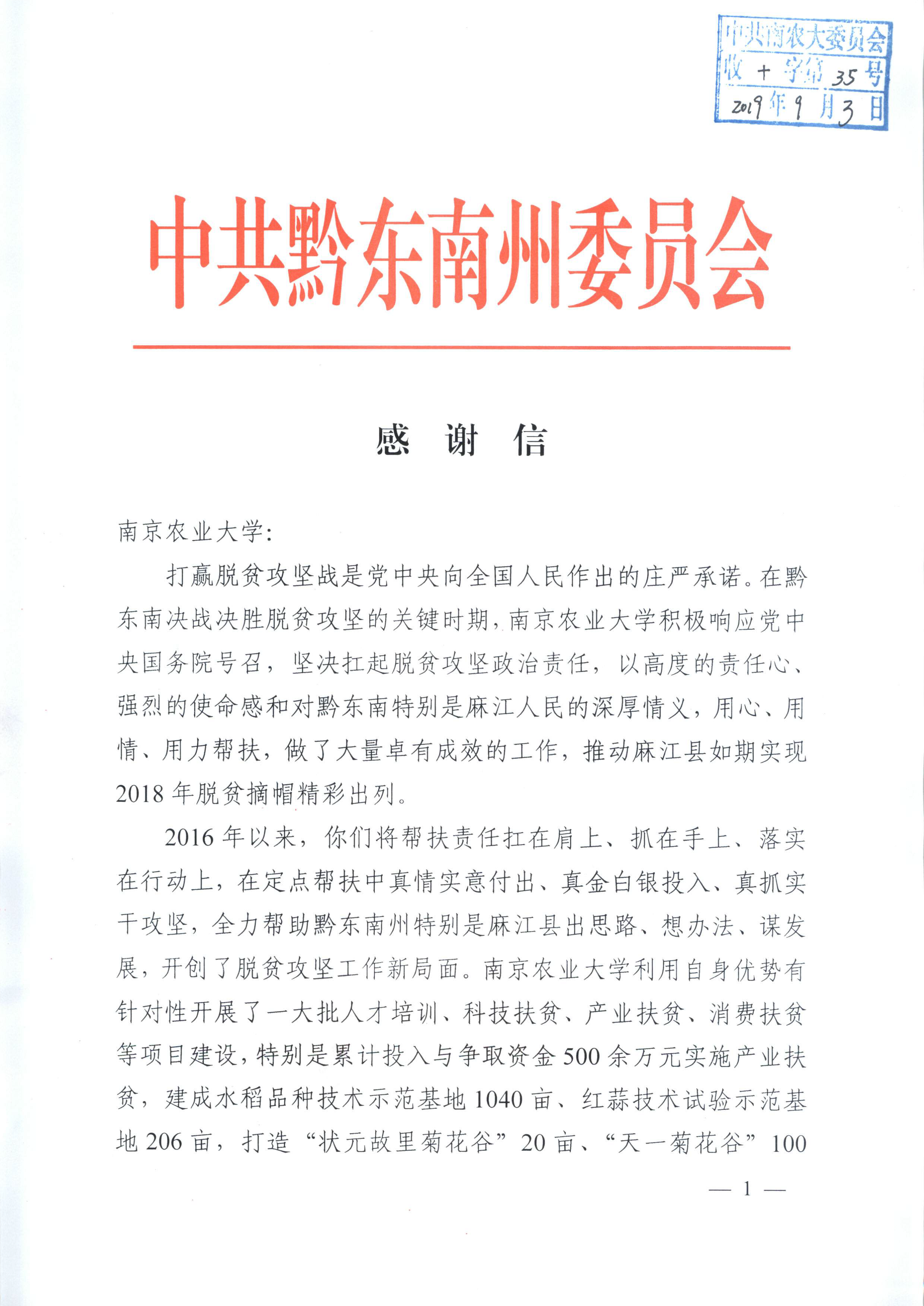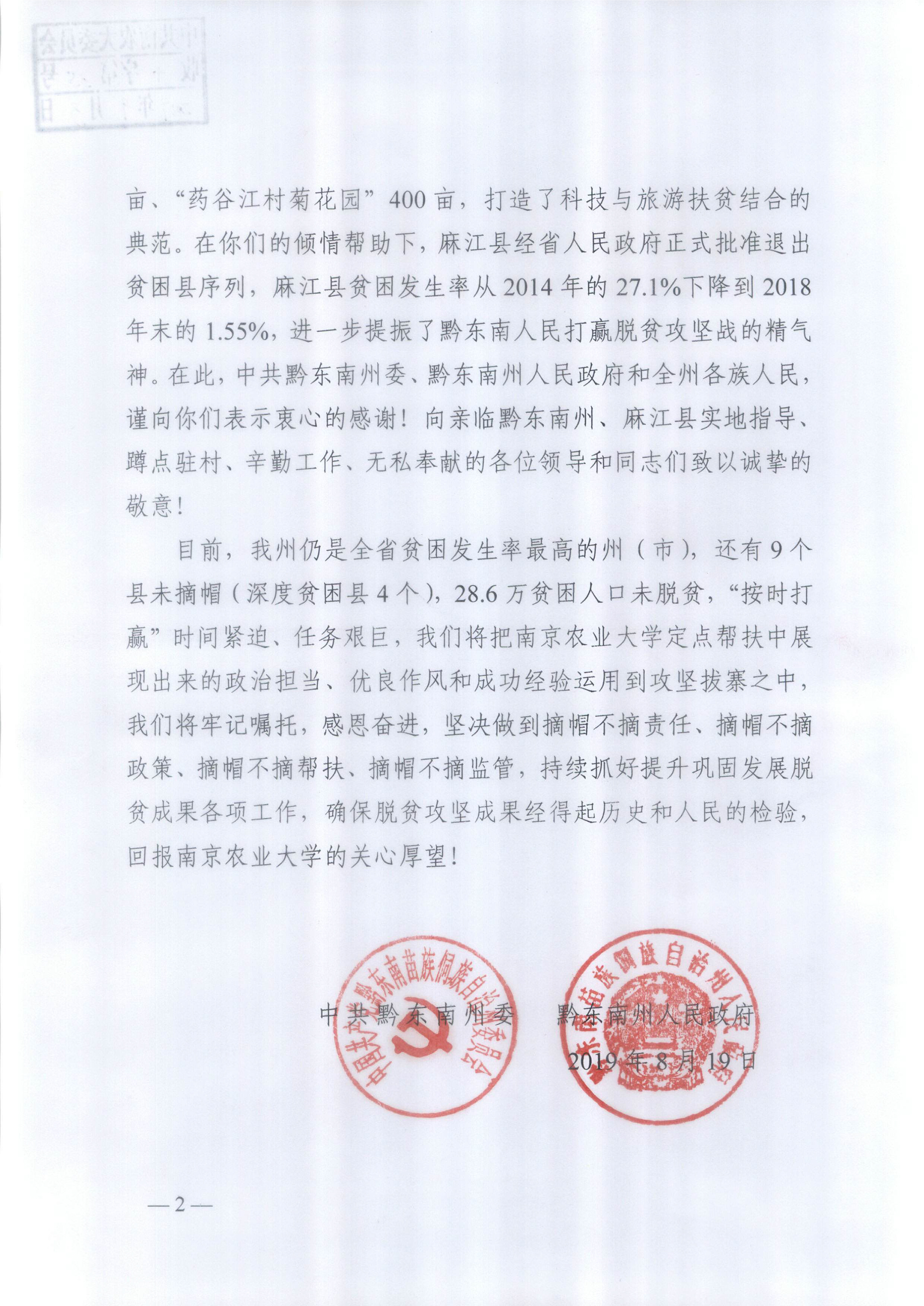 近日,中共贵州省黔东南苗族侗族自治州委员会、贵州省黔东南苗族侗族自治州人民政府再向我校发来感谢信,感谢我校在贵州省麻江县所做的定点扶贫工作。来信提到,在黔东南决战决胜脱贫攻坚的关键时期,ios版雷竞技官网积极响应党中央国务院号召,坚决扛起脱贫攻坚政治责任,以高度的责任心、强烈的使命感和对黔东南特别是麻江人民的深厚情义,用心、用情、用力帮扶,做了大量卓有成效的工作,推动麻江县如期实现2018年脱贫摘帽精彩出列。