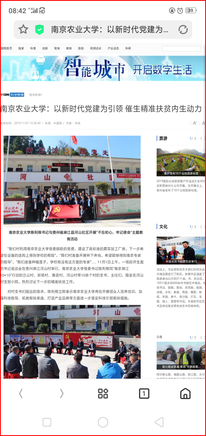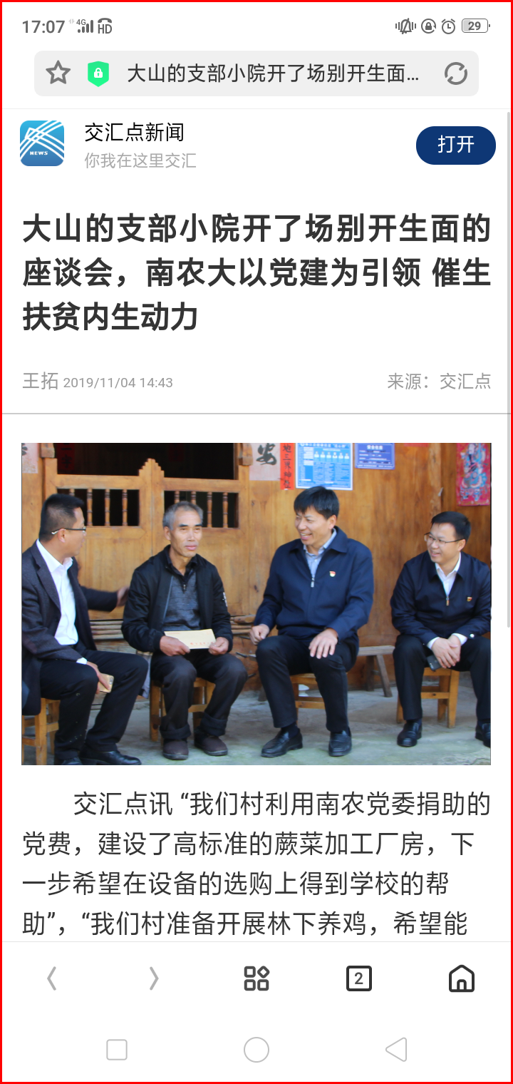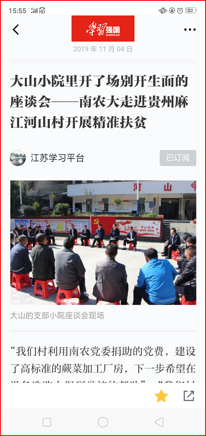 11月4日,围绕“大山小院精准扶贫座谈会-南农大以党建为引领,催生扶贫内生动力”的主题,“学习强国”、新华社、交汇点、中国网等多家媒体报道我校精准扶贫工作,介绍了我校“南农麻江10+10”行动以党建扶贫为引领,产业扶贫、教育扶贫、消费扶贫等方面的工作进展与创新举措,肯定我校在“不忘初心、牢记使命”主题教育热烈开展之际,深入调研座谈,对标找差确保扶贫工作精准发力,“守初心、担使命”,进一步唤醒贫困村脱贫攻坚与乡村振兴的必胜信心,绘就“南农-麻江”精准扶贫直通乡村振兴的新篇章。