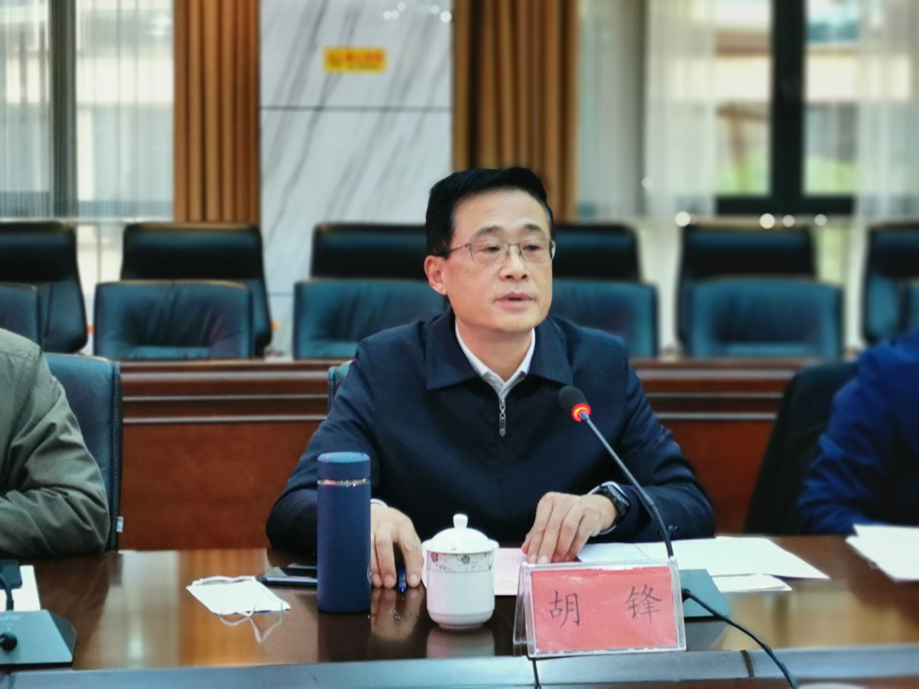 胡锋在会上讲话。他指出,在决战决胜脱贫攻坚全面收官、总结“十三五”谋划“十四五”之际,校地双方举行定点扶贫工作座谈会,既是双方深化合作机制,决心将校地扶贫推向纵深的宣誓;更是积极响应中央号召,落实党的十九届五中全会和教育部“2020年高校扶贫工作考核视频会”会议精神的具体行动。