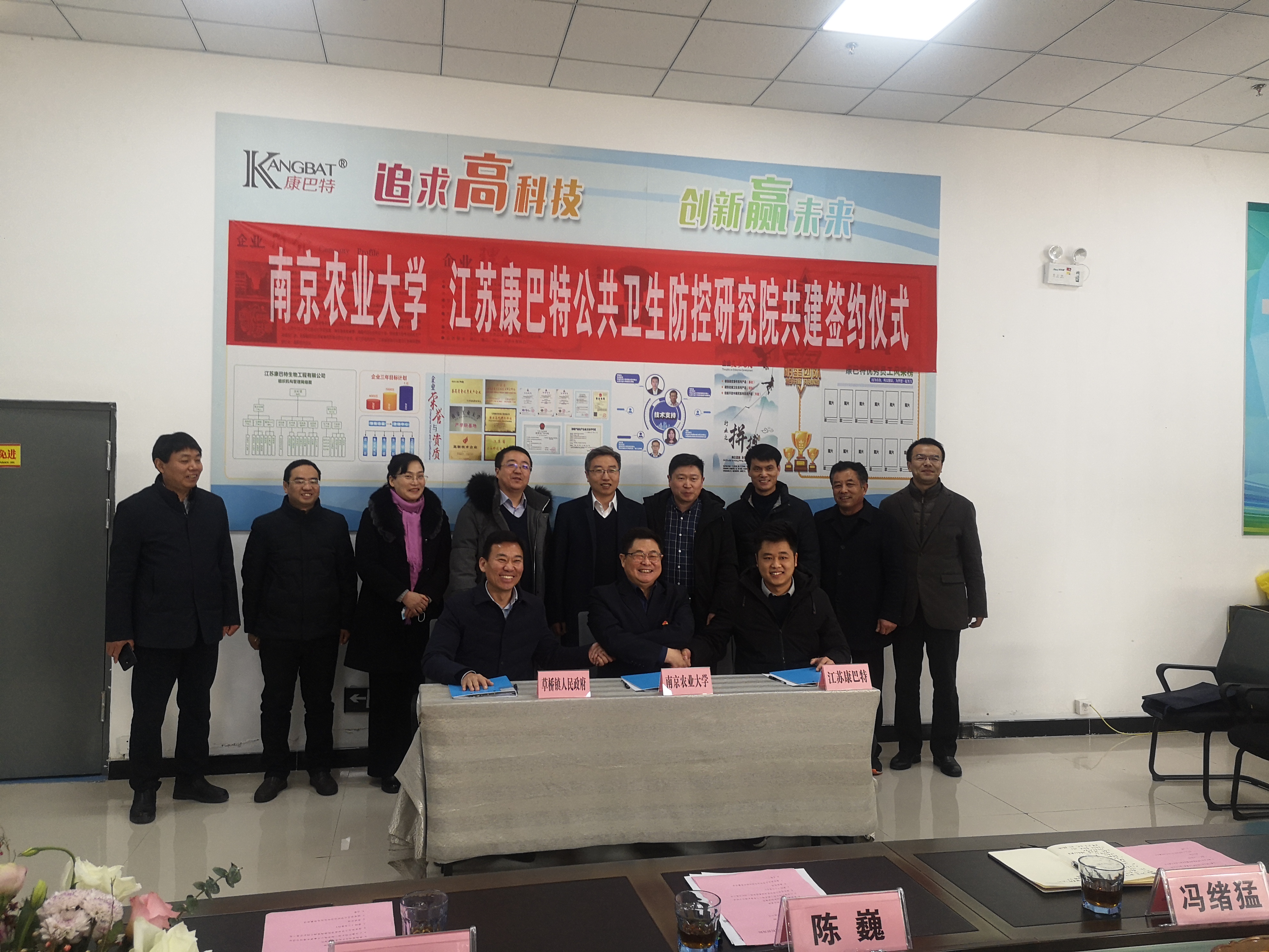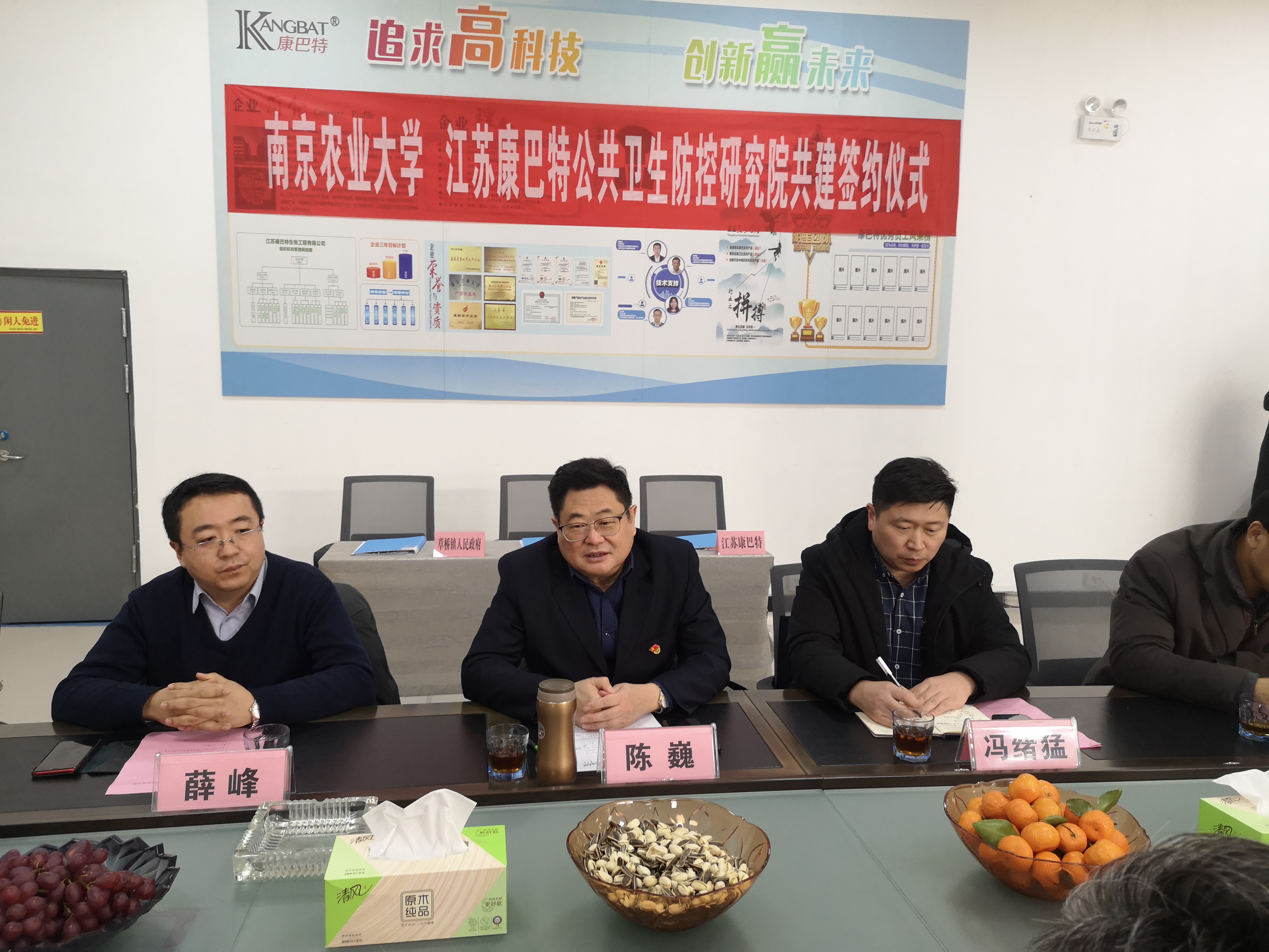 2021年1月27日下午,ios版雷竞技官网、新沂市草桥镇人民政府、江苏康巴特生物工程有限公司三方共建ios版雷竞技官网康巴特公共卫生防控研究院签约仪式在康巴特公司举行。我校社会合作处处长陈巍、新沂市副市长王夫寿,新沂市组织部、农业农村局、科技局、畜牧兽医站、草桥镇等部门领导及学校相关专家参加了本次签约仪式。会议由我校人文与社会发展学院党委副书记冯绪猛主持。