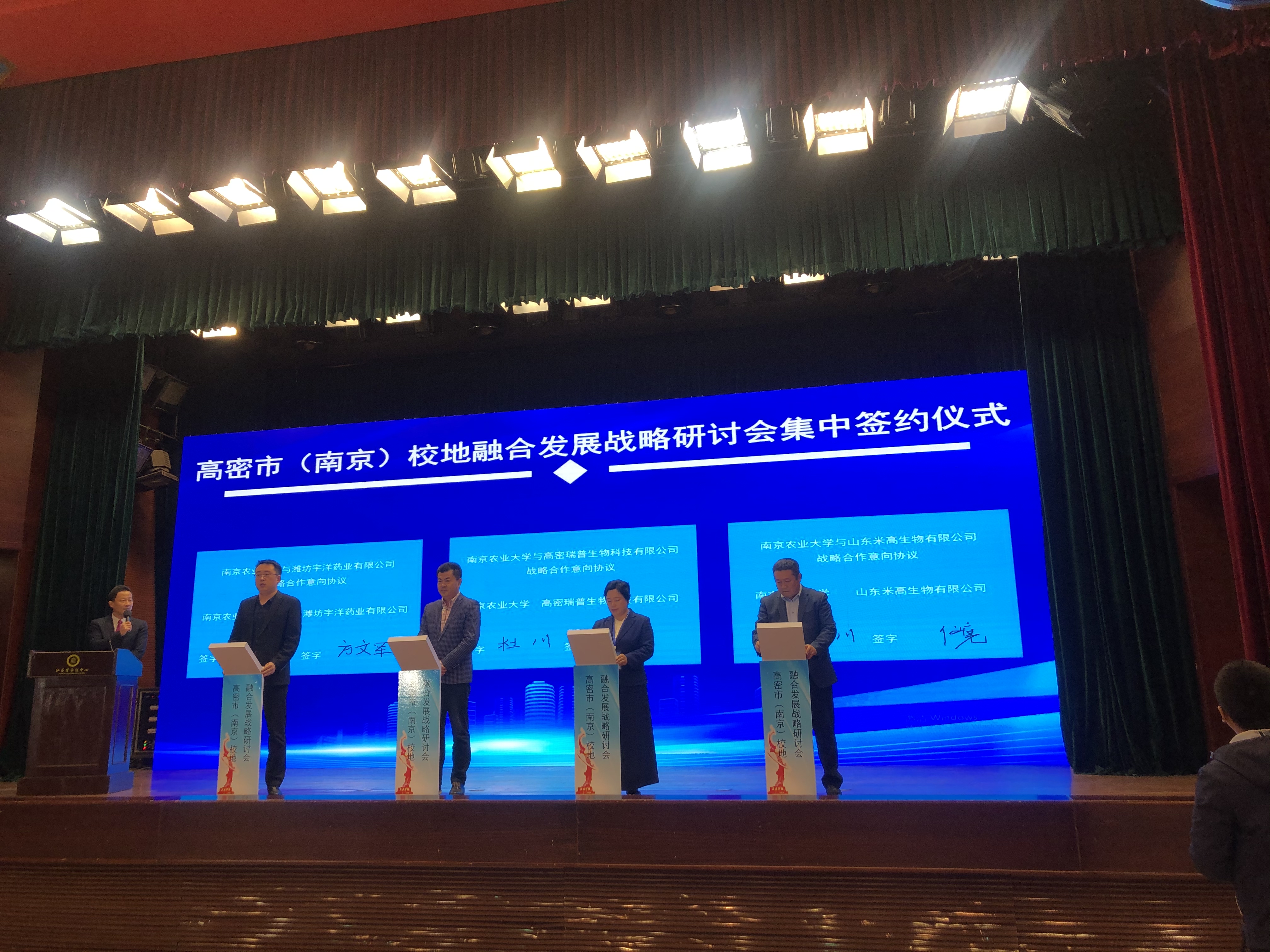 活动现场举行了集中签约仪式,我校社会合作处处长助理杜川代表学校与潍坊宇洋药业有限公司、高密瑞普生物科技有公司和山东米高生物有限公司现场签署合作协议,与高密市企业达成多项合作意向。