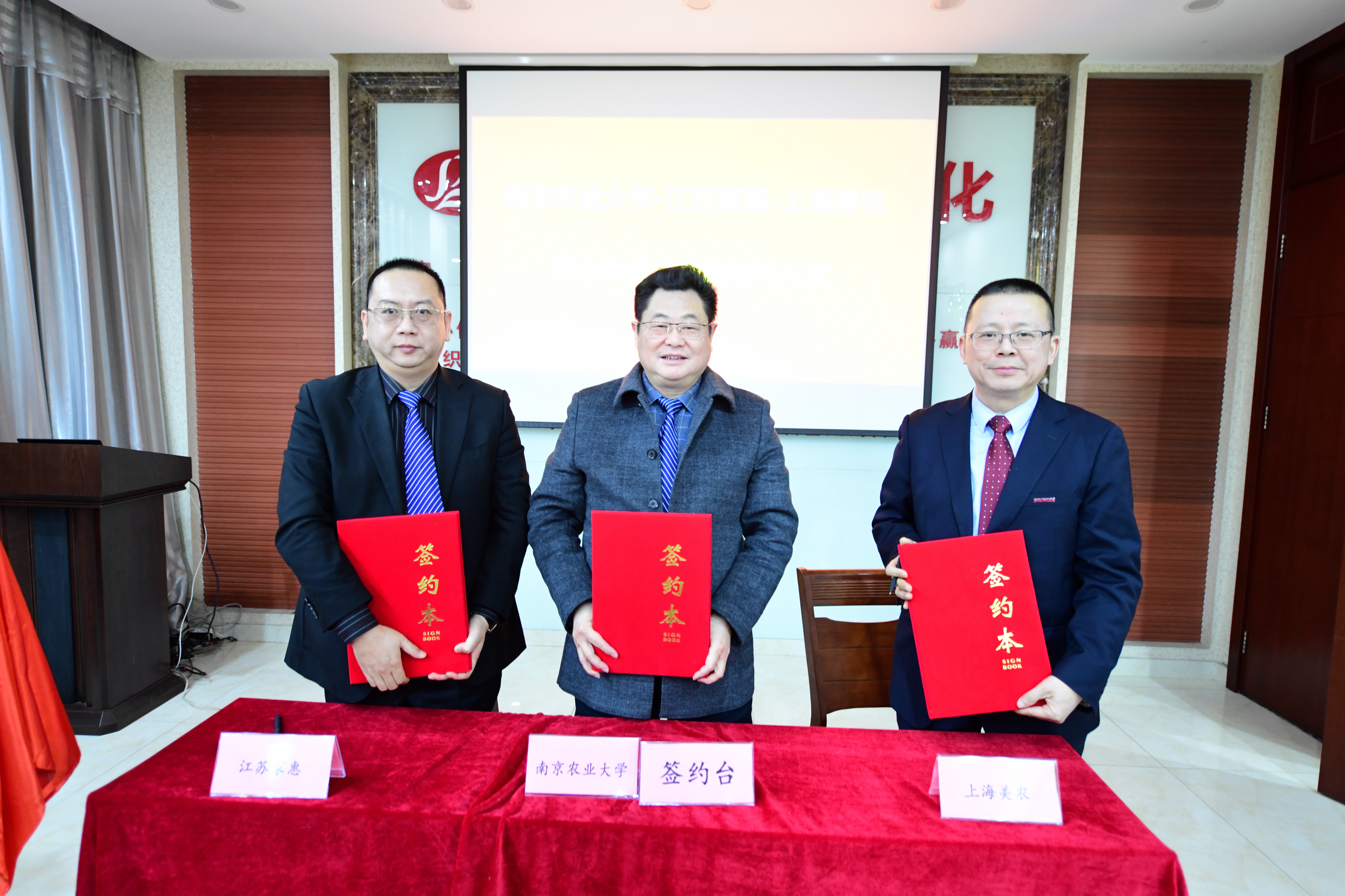 丁艳锋和丁兴育为工作站揭牌。陈巍代表学校与上海美农总经理洪伟、江苏家惠总裁陈锋续签工作站共建协议书。