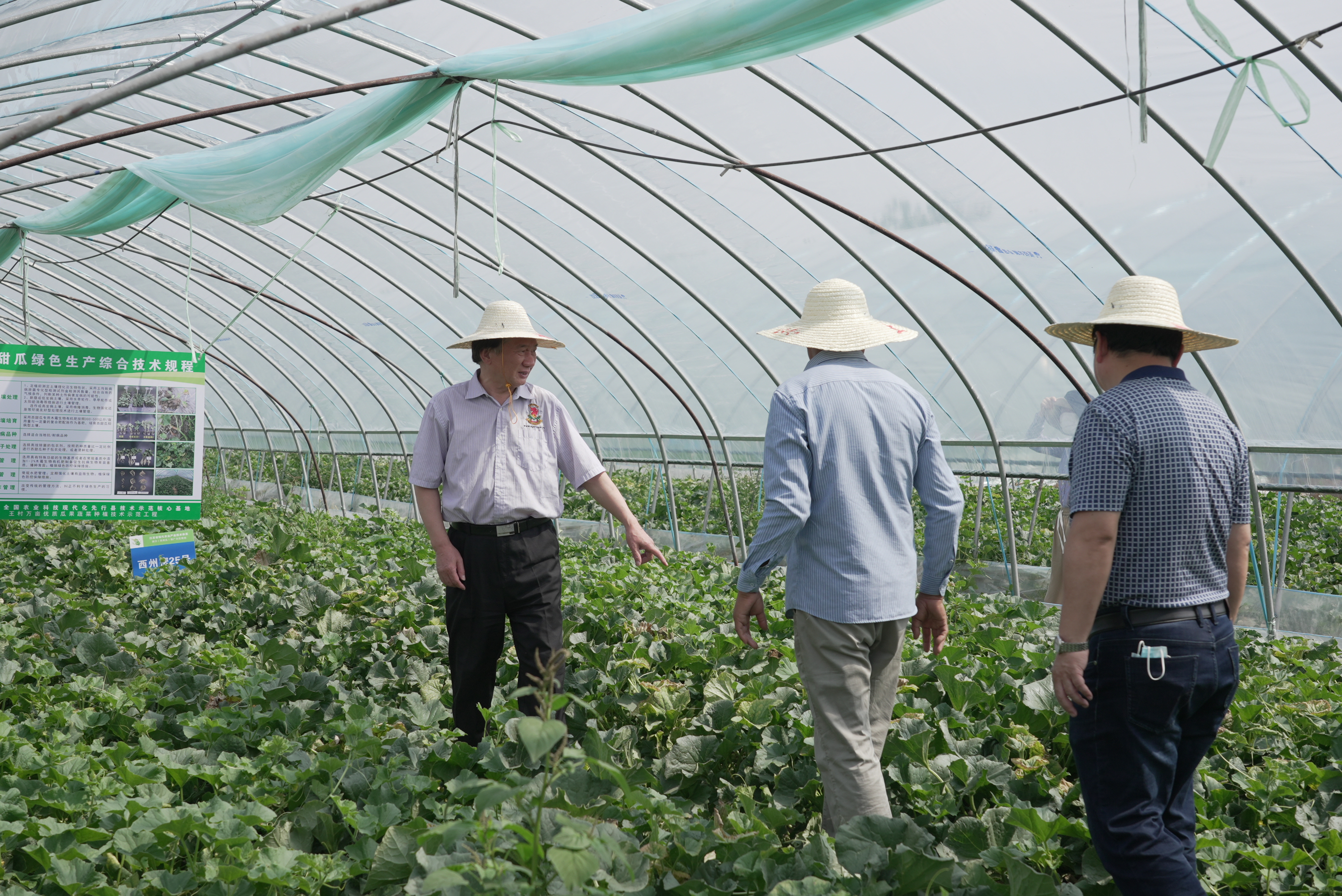 瓜棚内,郁郁葱葱的茎叶满地蔓延,一个个甜瓜正披着翠绿色的外衣“卧”在地上。沈其荣院士仔细查看了瓜的长势、着果情况,对基地内西甜瓜绿色简约化栽培新技术给予了肯定。沈其荣院士围绕当地西甜瓜品种示范、连作障碍防控、果品质量提升等做出精确指导,精准把脉,对甜瓜叶片出现的不同症状进行了讲解和答疑,为瓜田今后精准施肥提出了更好的建议。