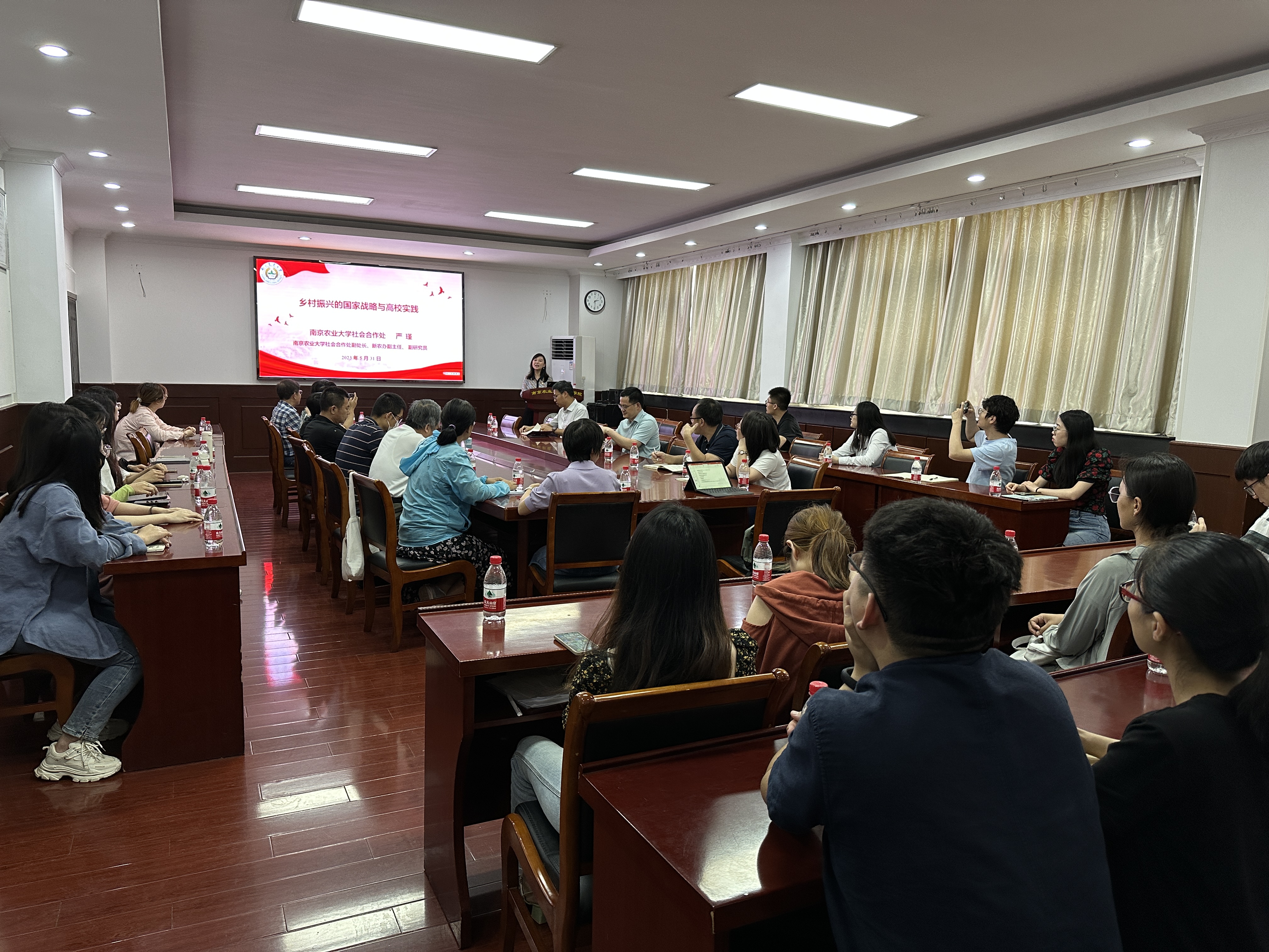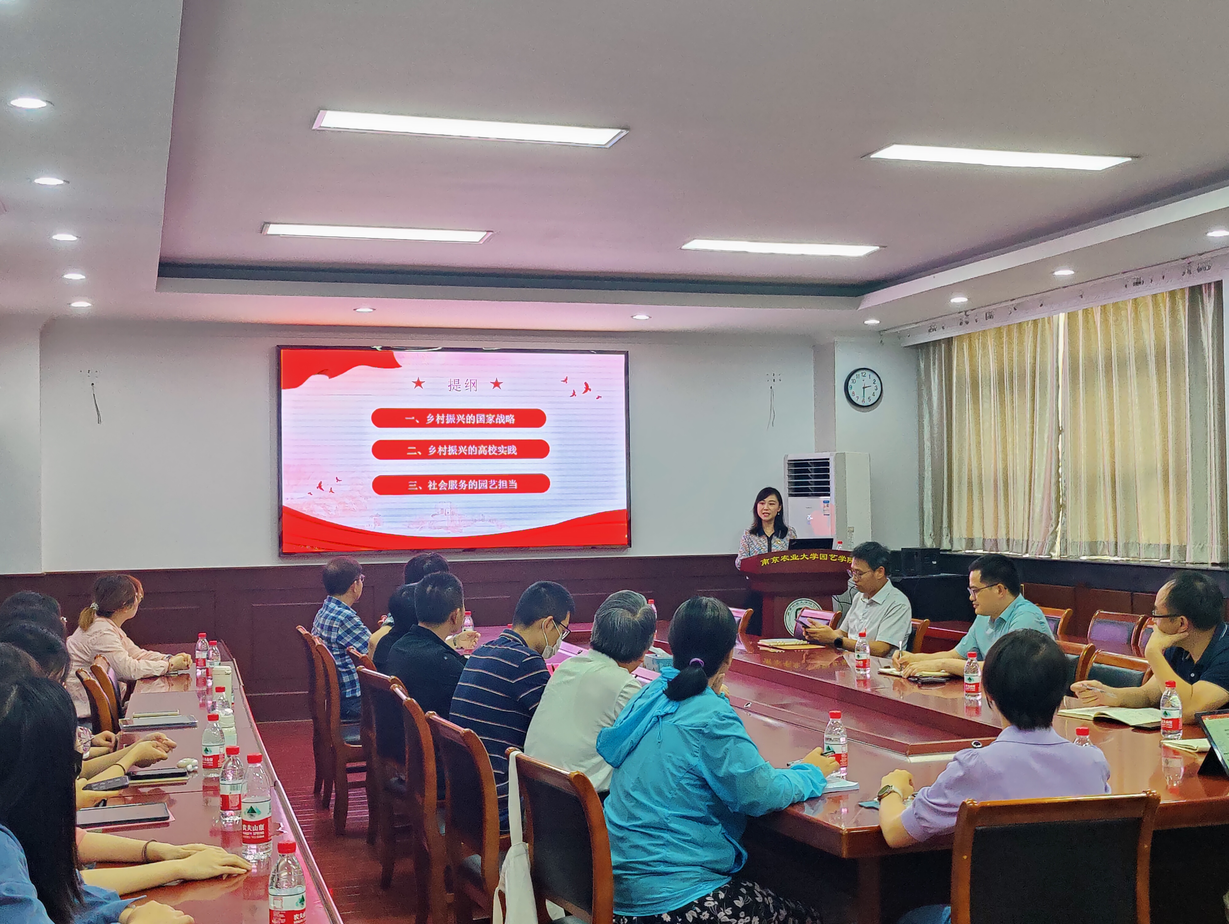 5月31日,社会合作处积极联系园艺学院组织开展主题教育党课和调研活动,社会合作处副处长严瑾作题为《乡村振兴的国家战略与高校实践》的党课报告,并在会后与园艺学院师生代表调研座谈。严瑾副处长联系的园艺蔬菜设施教师党支部全体党员参会,同时蔬菜博士研究生党支部全体党员以及园艺学院各个师生党支部代表均参加了本次主题教育联学活动。会议由蔬菜设施教师党支部书记李季主持,园艺学院党委书记韩健全程参会并作总结讲话。