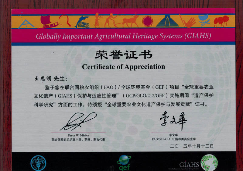 我院中华农业文明研究院院长王思明教授荣获联合国与全球环境基金GIAHS...