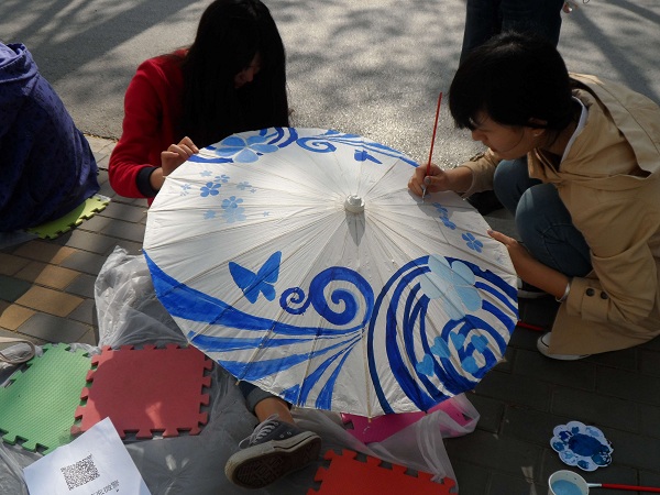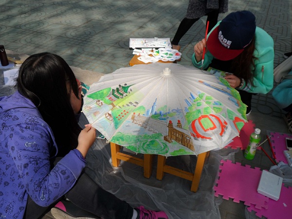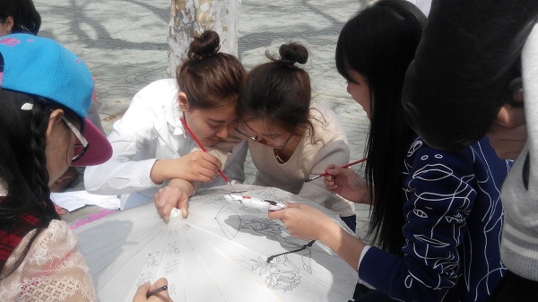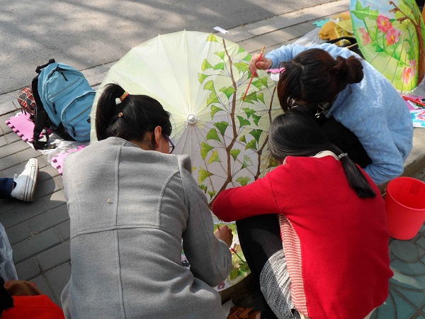 两个小时的合作上色时间一点儿都不够,舍友间暖暖的情谊如潮水般涌流,我们看到了大家互相合作上色,让颜料在油纸伞上跳动的浓情画面。