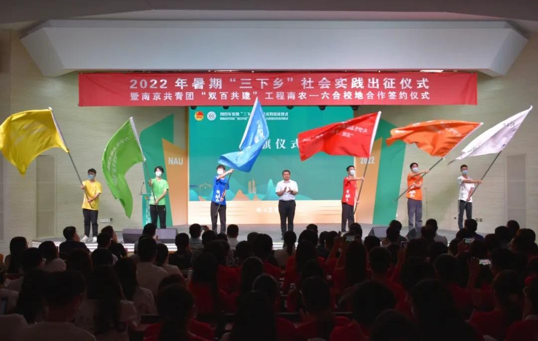 6月29日下午,我校2022年暑期“三下乡”社会实践出征仪式暨南京共青团“双百共建”工程南农-六合校地合作签约仪式在大学生活动中心举办。校党委副书记刘营军,校党委常委、副校长董维春,江苏团省委社会联络部部长汤江林,南京团市委副书记许烨、基层组织建设部部长丁鑫钧,江苏百绿园林集团有限公司总经理徐鹏,校内相关部门领导及部分涉农企业代表、社会实践指导教师和200余名学生代表参加活动。出征仪式由校团委书记谭智贇主持。
