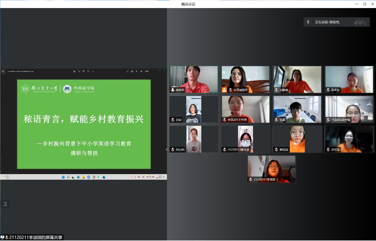 7月7日,外国语学院“秾语青言,赋能乡村教育振兴”实践团队开展专题调研。团队成员面向学生、教师、家长等不同群体,以线上线下双渠道的形式发放问卷。此次调研主要聚焦贵州、安徽、湖南、山西等十个省共计二十个市的脱贫攻坚摘帽地区,对比脱贫摘帽前后变化,围绕中小学生英语的学习情况进行了深入访谈,立足学科特色,深入推进教育帮扶,助力乡村全方位振兴。