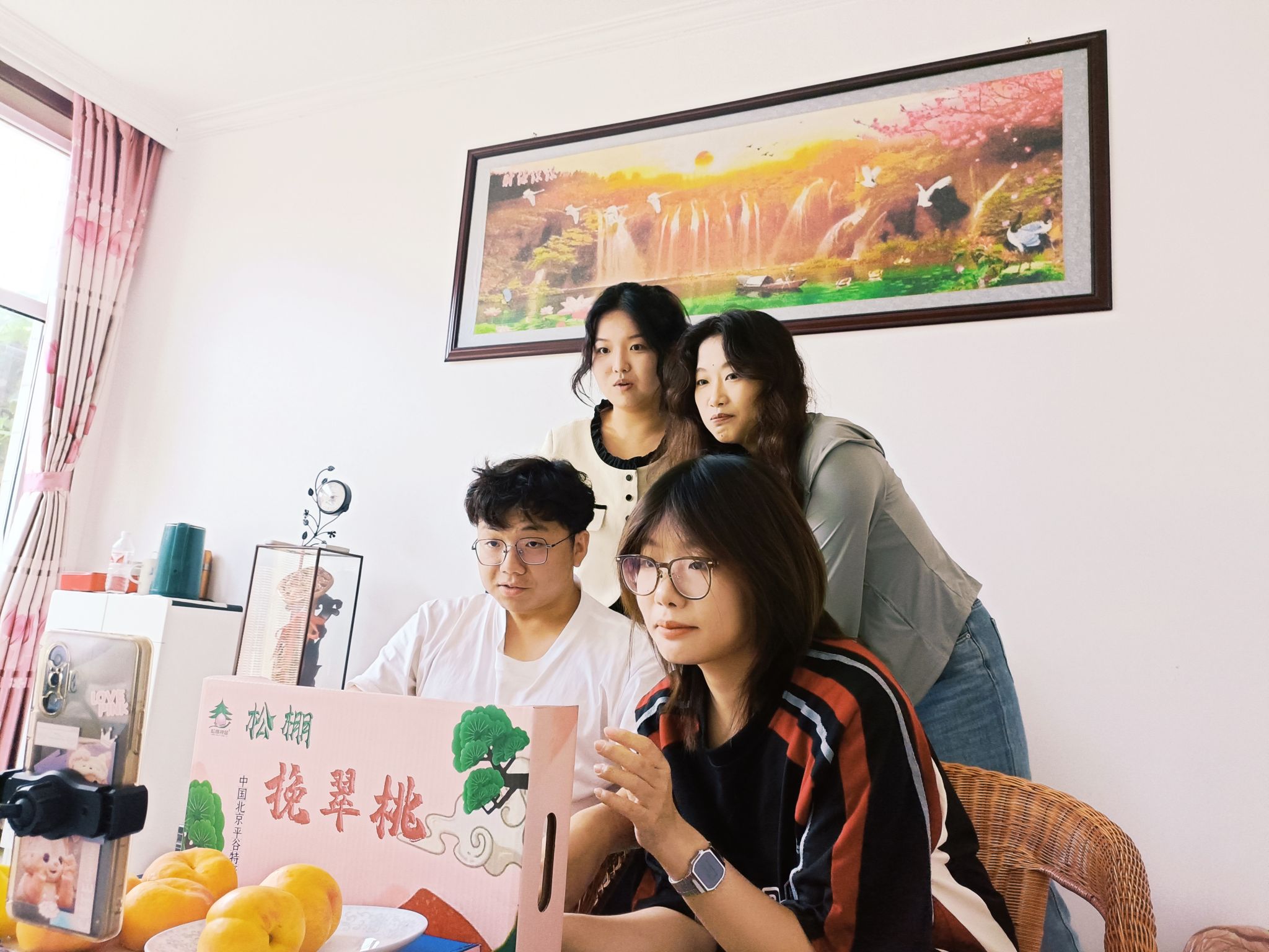 直播前,实践团成员进行大桃销售平台维护管理、物流信息整理录入,深入果园参与摘桃、包桃等活动,用心用情体验农事农活、品味农耕文化、感受和美乡村。近半个月的充分准备和实践走访,实践团成员深入了解了果农困境与需求,通过“市集+直播”“线上+线下”的形式,积极发挥自身优势,化身“主播”,用生动有趣的话术和不时地即兴表演与网友们互动,积极推介刘家店镇“丫髻福桃”,用直播带货的方式助力大桃销售,推动助农增收。