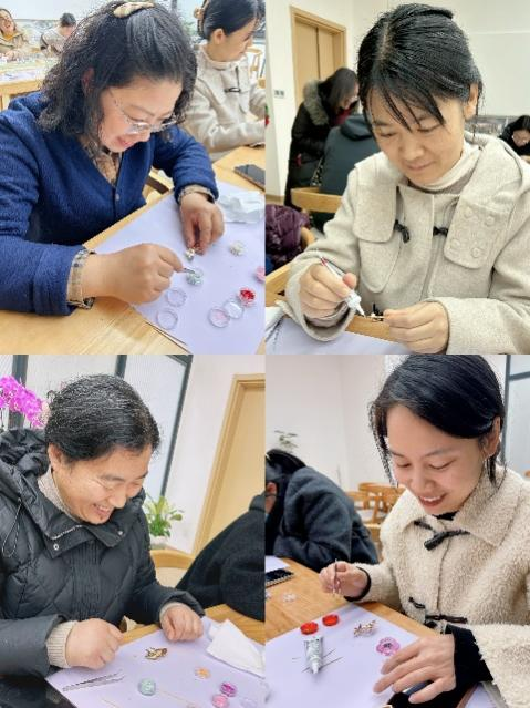 通过制作螺钿胸针这一承载着商周文明印记的传统工艺,女老师们在指尖与贝母的对话中,感受中华工匠精神的生生不息。创作过程中,科研能手们化身艺术匠人,实验记录的严谨化作造型构图的精妙,分子操作的精准转为贝片裁切的细致。本次沙龙创新性地将非遗传承与师德建设相结合,既延续了支部"以美育人"的传统,更彰显了新时代女性知识分子的多元风采。