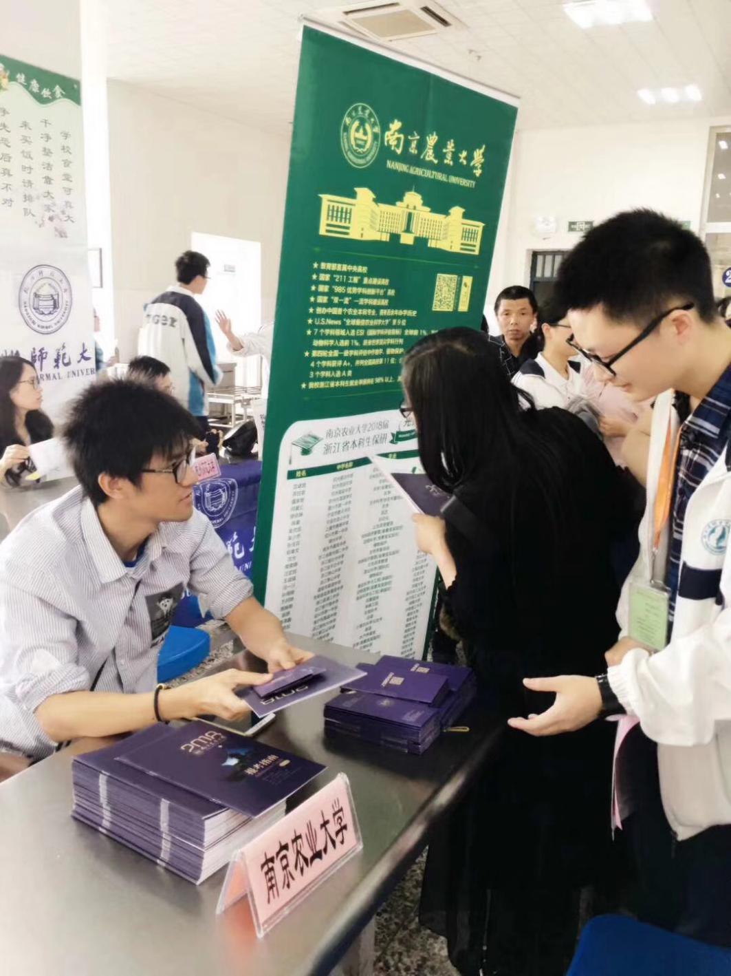 4月27日,我校公共管理学院应浙江省桐乡高级中学邀请参加由浙江省考试院举办的桐乡市高级中学高校招生咨询会,ios版雷竞技官网后勤集团饮食服务中心主任朱卢玺、公共管理学院辅导员魏威岗一行前往参加。桐乡市高级中学作为浙江省最优秀的中学之一,其生源质量和教育模式在众多中学中可谓首屈一指,本次活动桐乡市高级中学面向全国共邀请了70多家高校参与此次招生宣传活动。